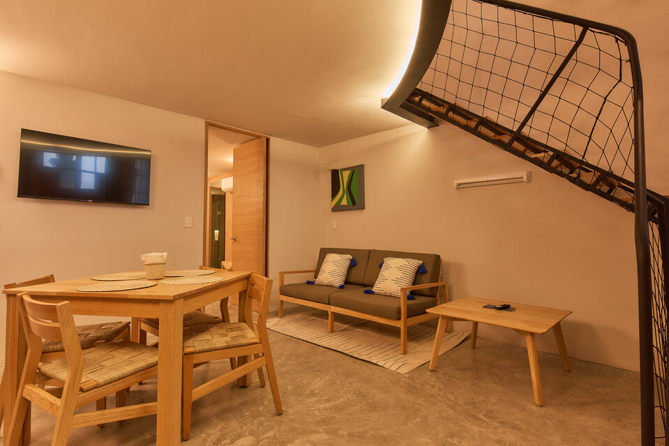 Descubre RUFINO, nuestro espacioso departamento de dos recámaras en el centro de la ciudad de Oaxaca. Con 59 m2 de superficie habitable, ofrece comedor, cocina, salón y un dormitorio independiente con su propio baño en la planta inferior. El entresuelo cuenta con un dormitorio abierto y un baño privado. Disfrute de tres pantallas de TV 4K de 43 pulgadas, Wi-Fi y un patio cubierto y completamente amueblado en la entrada. Los huéspedes también pueden utilizar la terraza común en el segundo piso. Elija RUFINO para una estancia inolvidable.